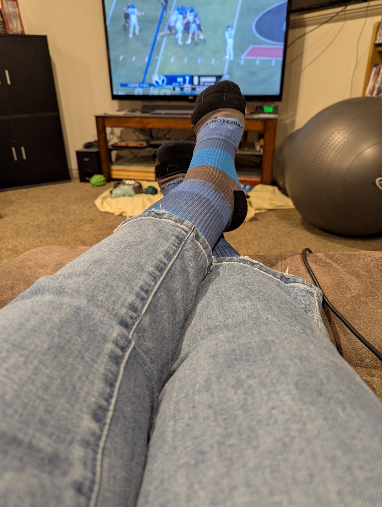 Crazy Leg Style: Democracy jeans & Crazy Compression Socks (Stitch, the Corgi’s yellow sheet with his toys in the background)